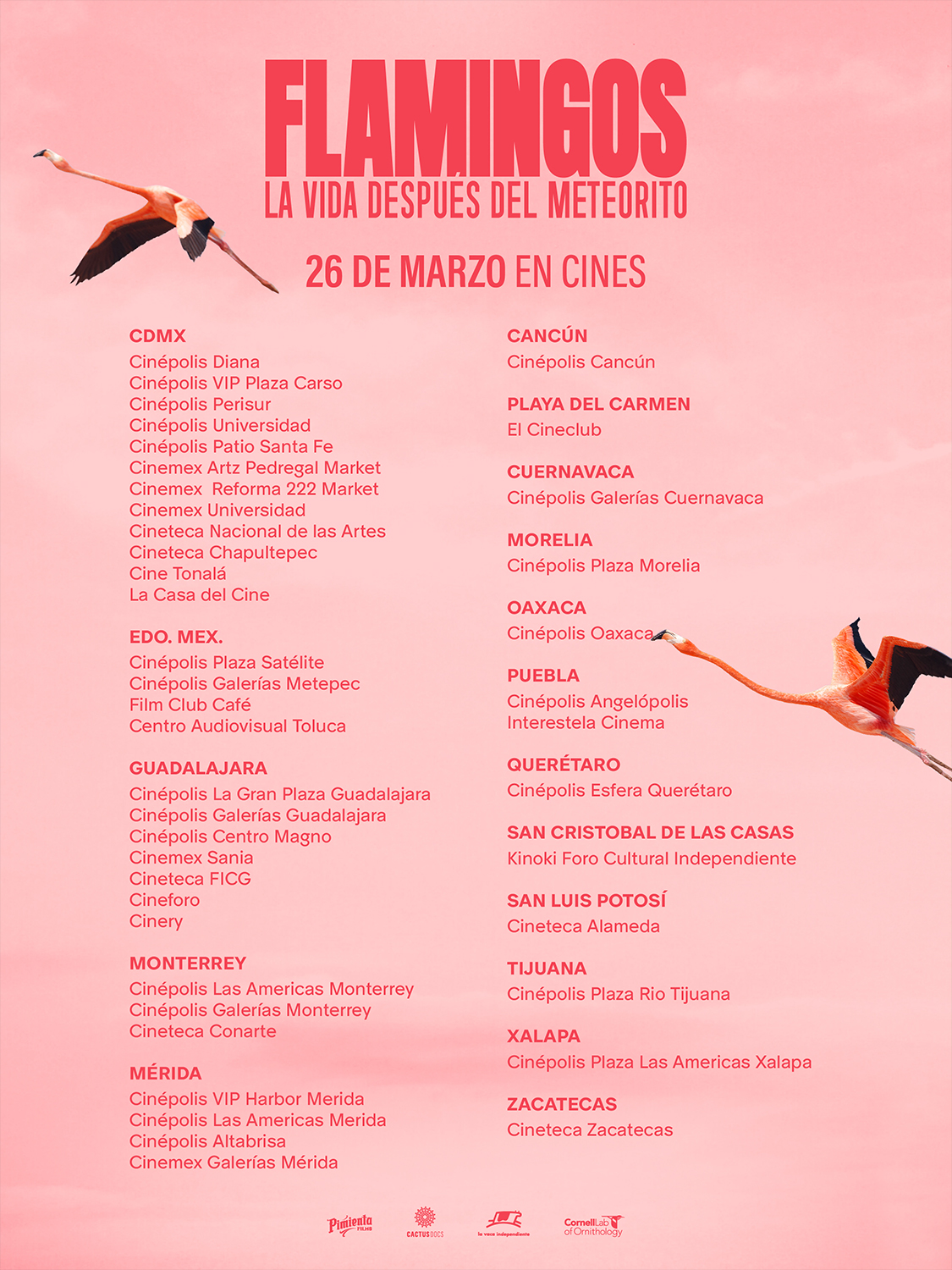Con su estreno en salas de cine y circuitos culturales, Flamingos: la vida después del meteorito invita a redescubrir uno de los paisajes naturales más emblemáticos de México y a reflexionar sobre la capacidad de la vida para florecer incluso después de las mayores catástrofes del planeta.